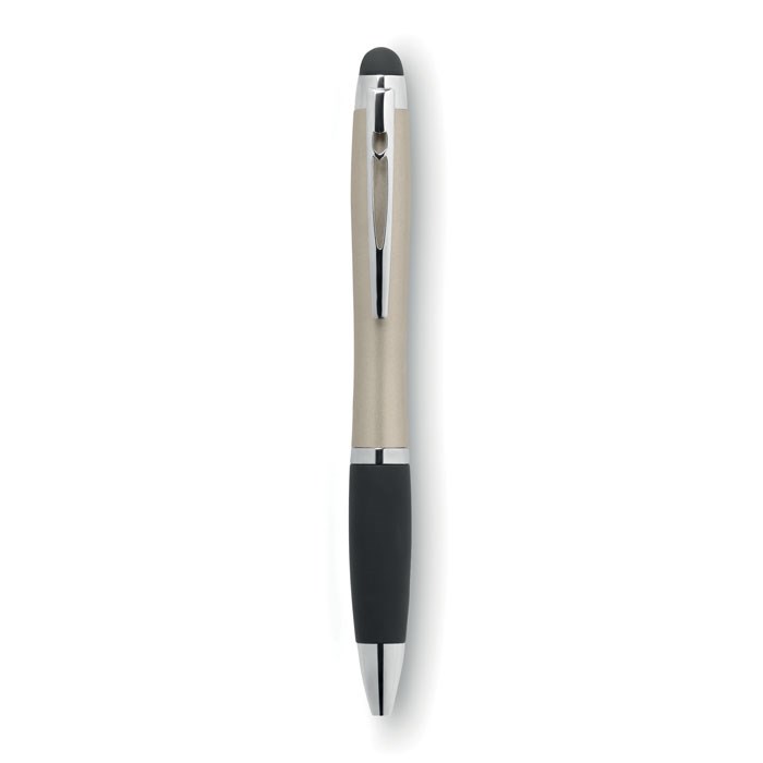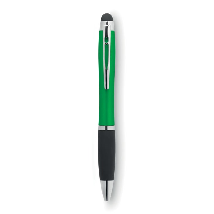 ABS metallic balpen met lichtje, touch tip en zachte grip. Bij het graveren van het logo licht het logo op. Bij tampondruk licht het logo niet op. Blauwe inkt en draaimechanisme. Inclusief 3x AG3 batterijen.
