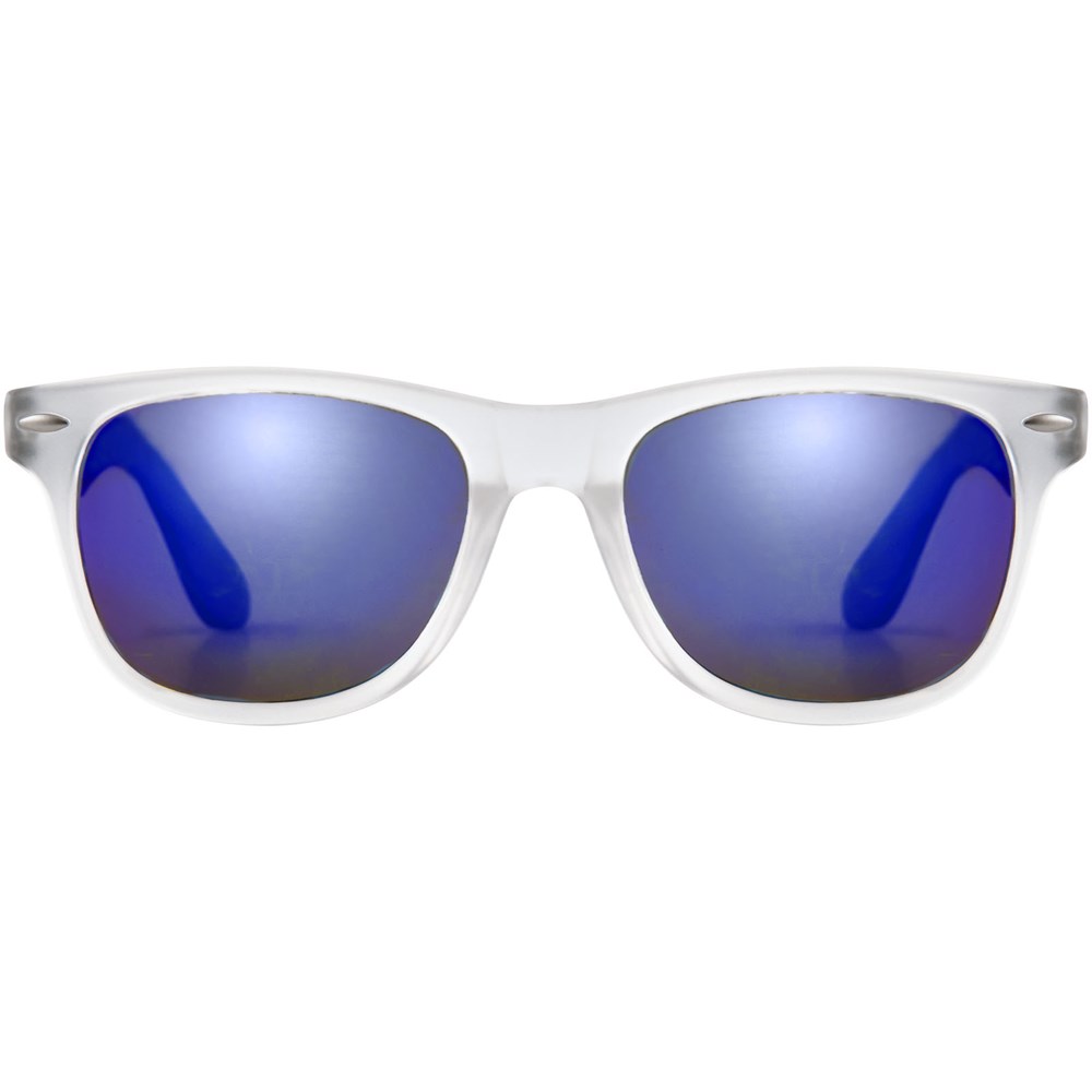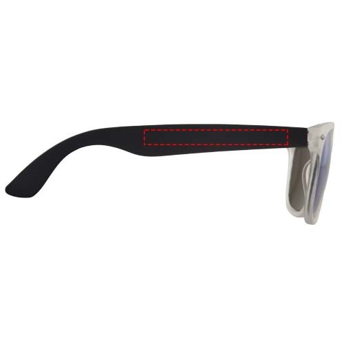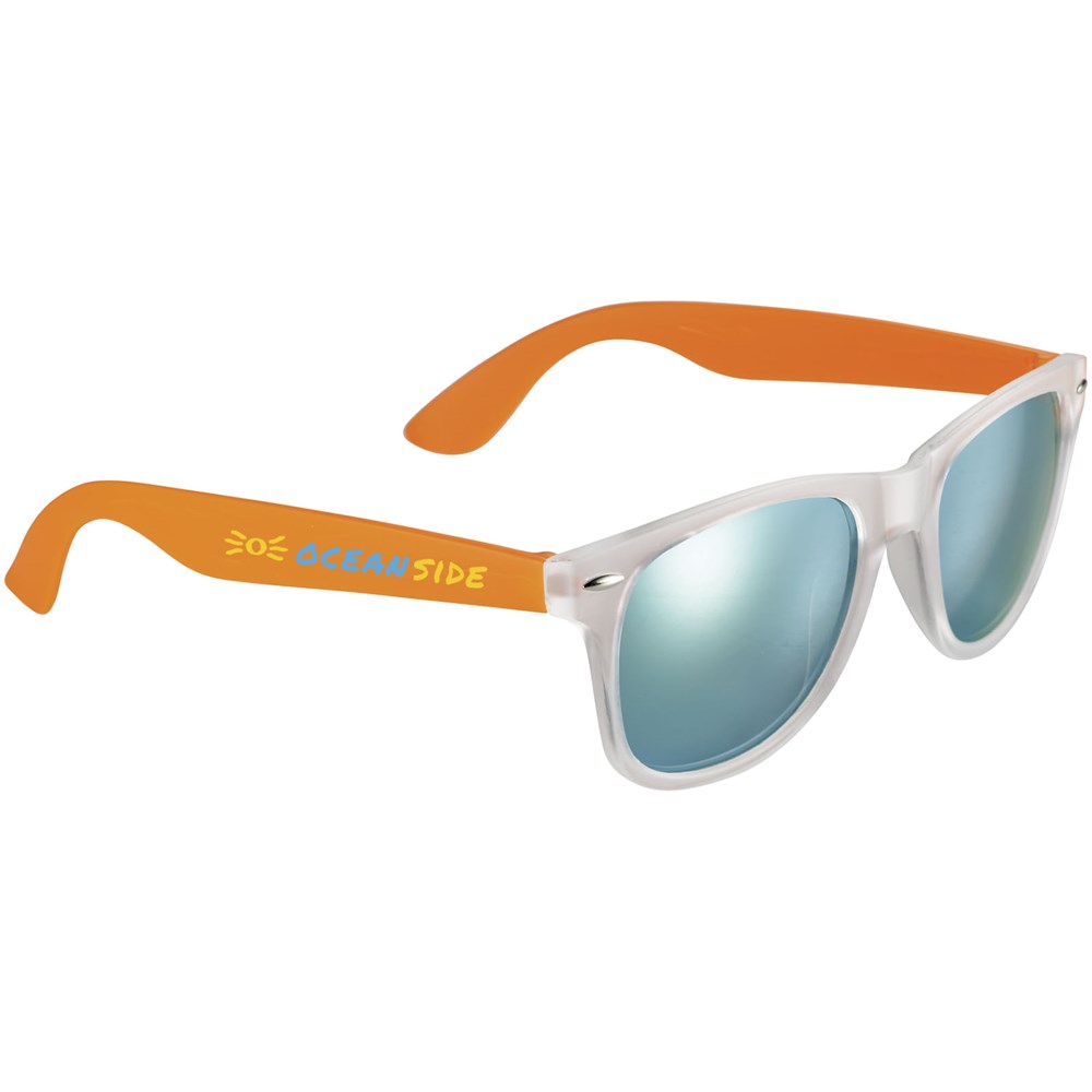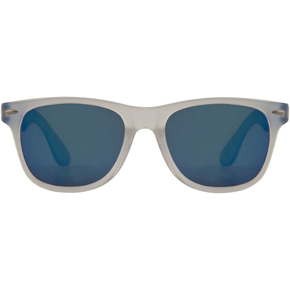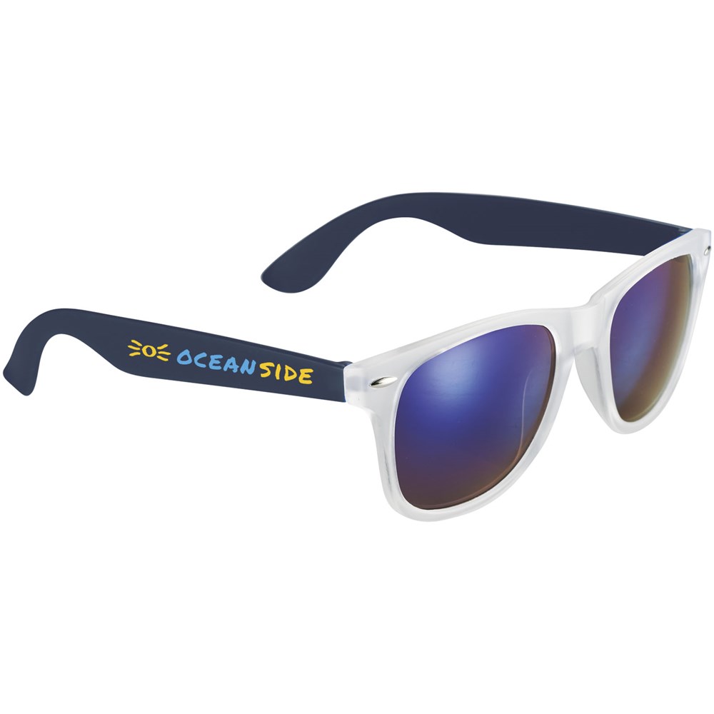 Retro design glazen met mat witte frame, categorie 3 spiegellenzen in 3 verschillende tinten en bijpassend kleur tinten. Conform EN ISO 12312-1 en met UV400. Standaard komt de bedrukking op 1 pootje.