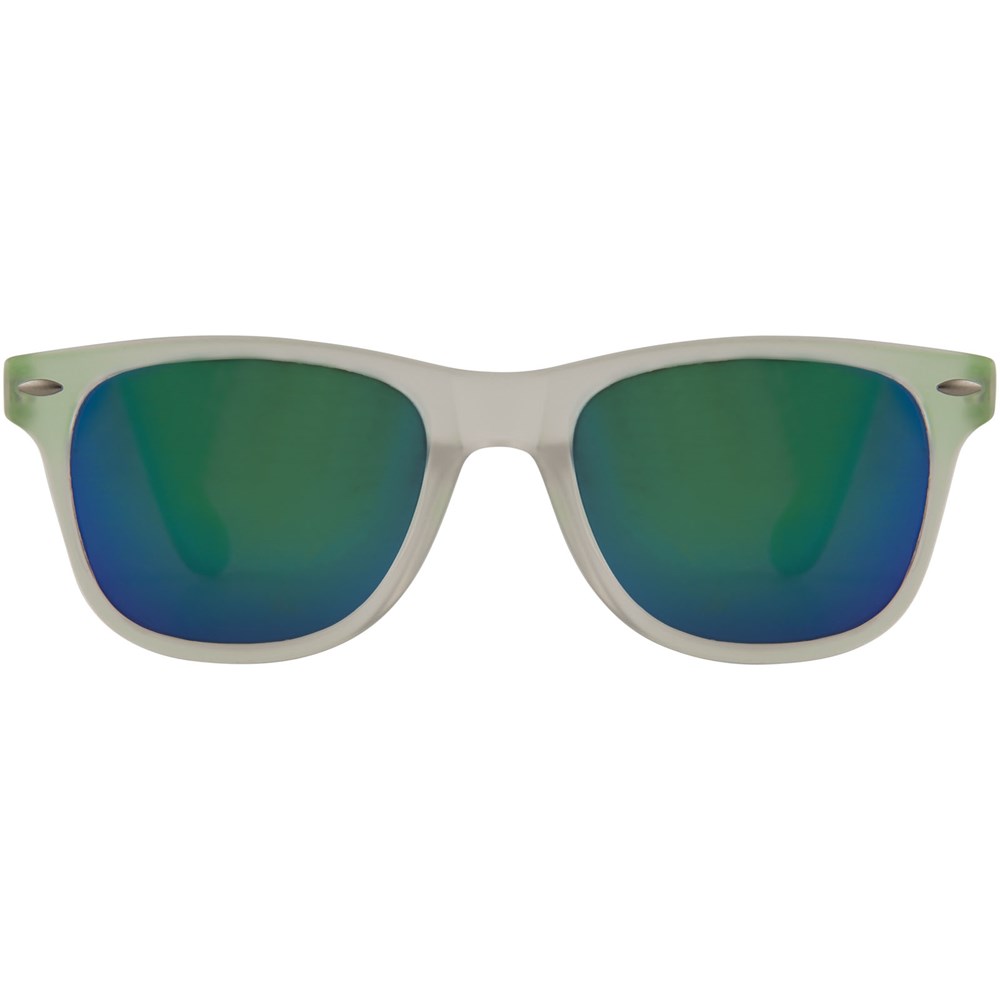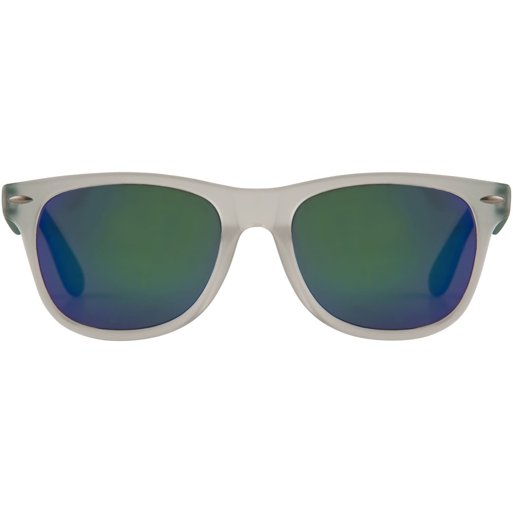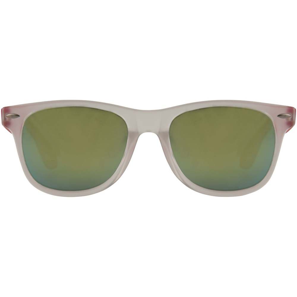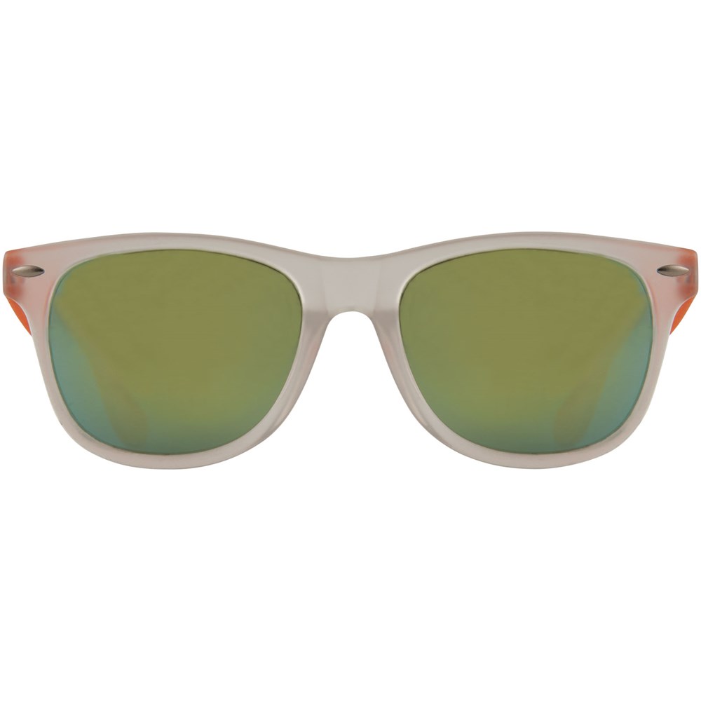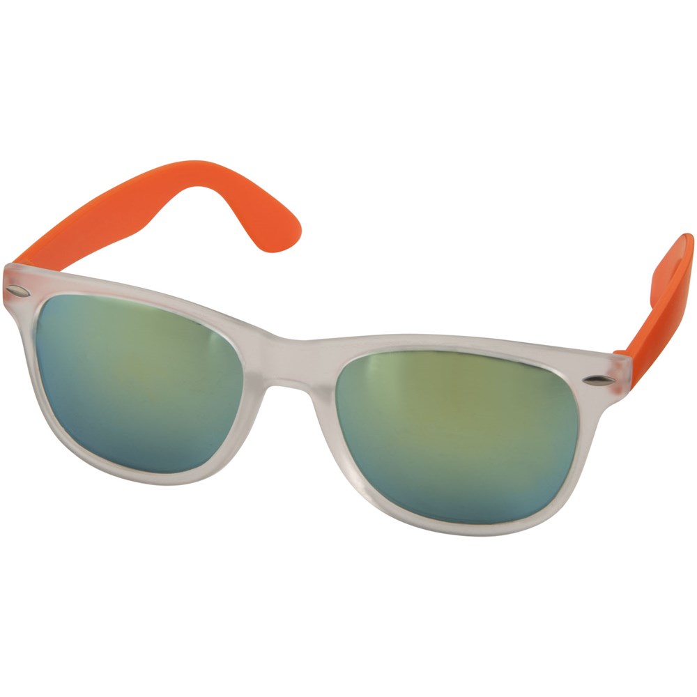 Retro design glazen met mat witte frame, categorie 3 spiegellenzen in 3 verschillende tinten en bijpassend kleur tinten. Conform EN ISO 12312-1 en met UV400. Standaard komt de bedrukking op 1 pootje.
