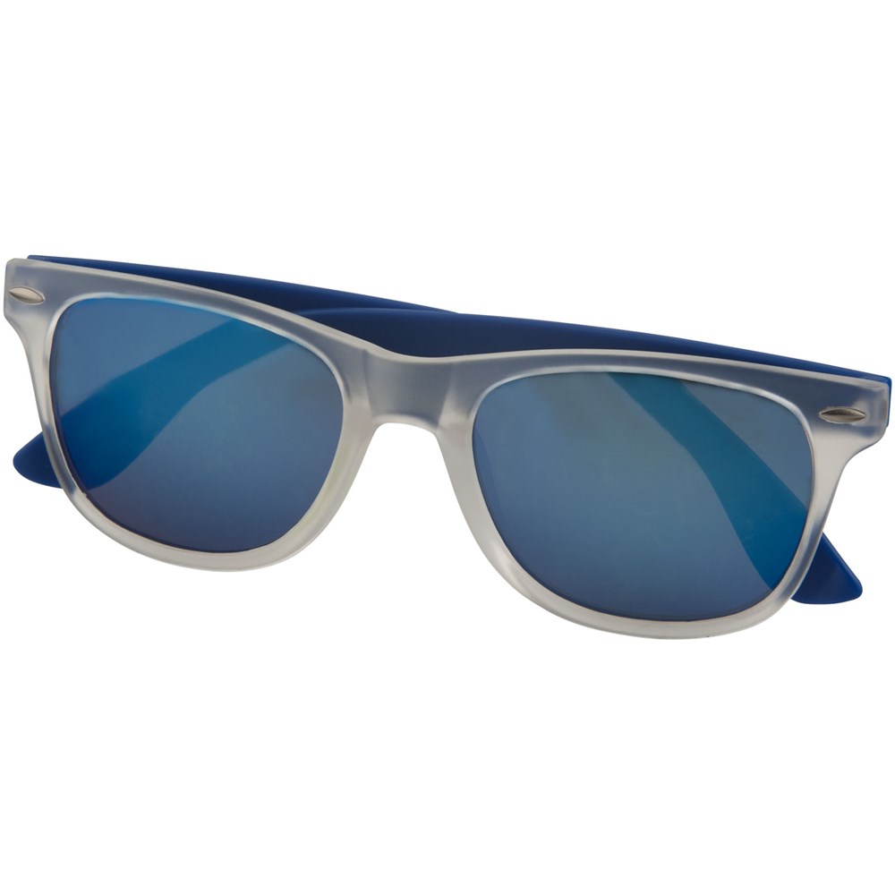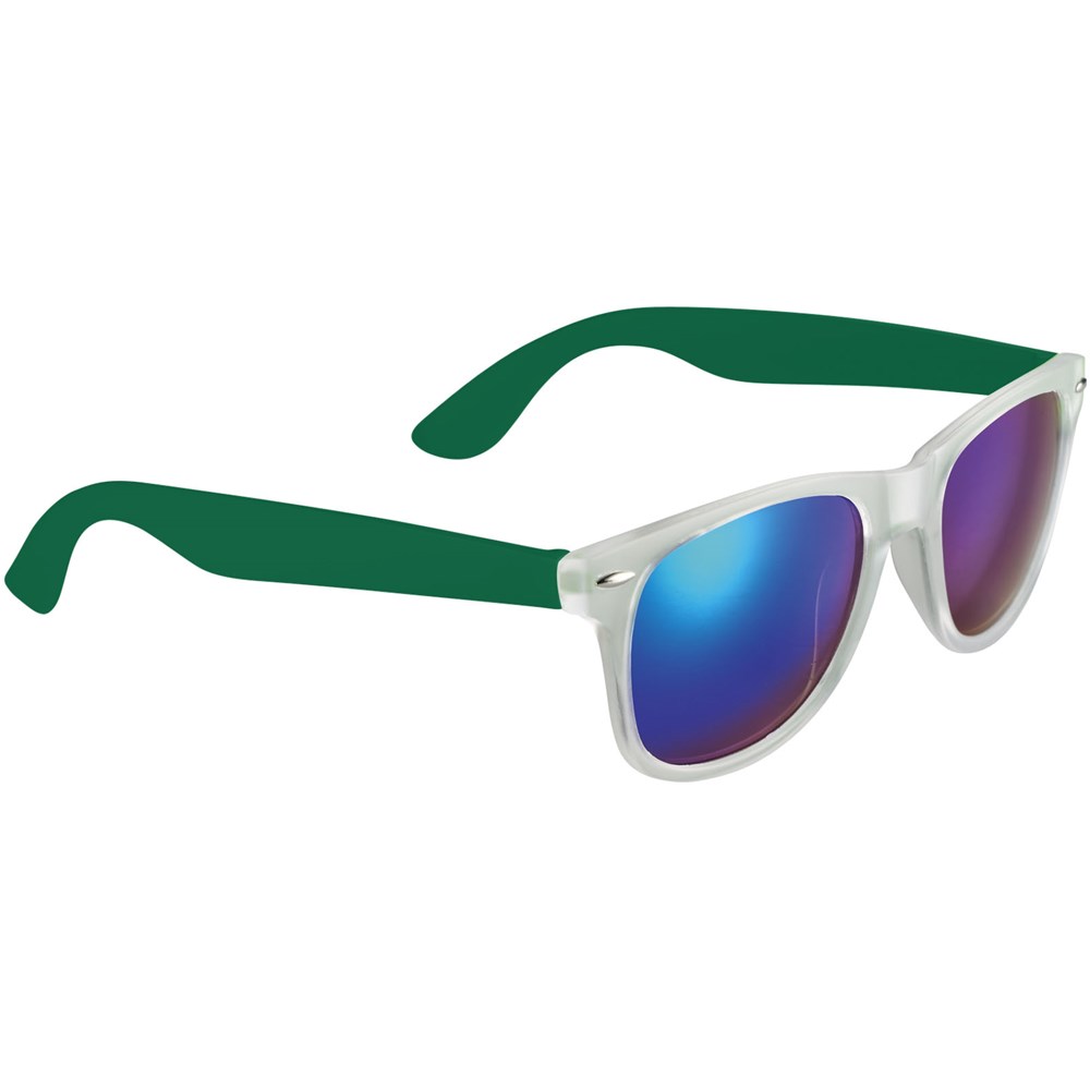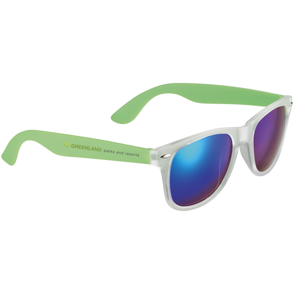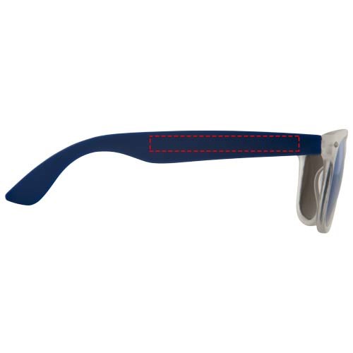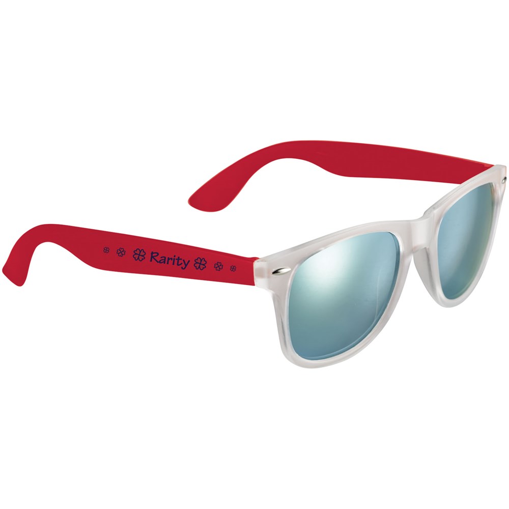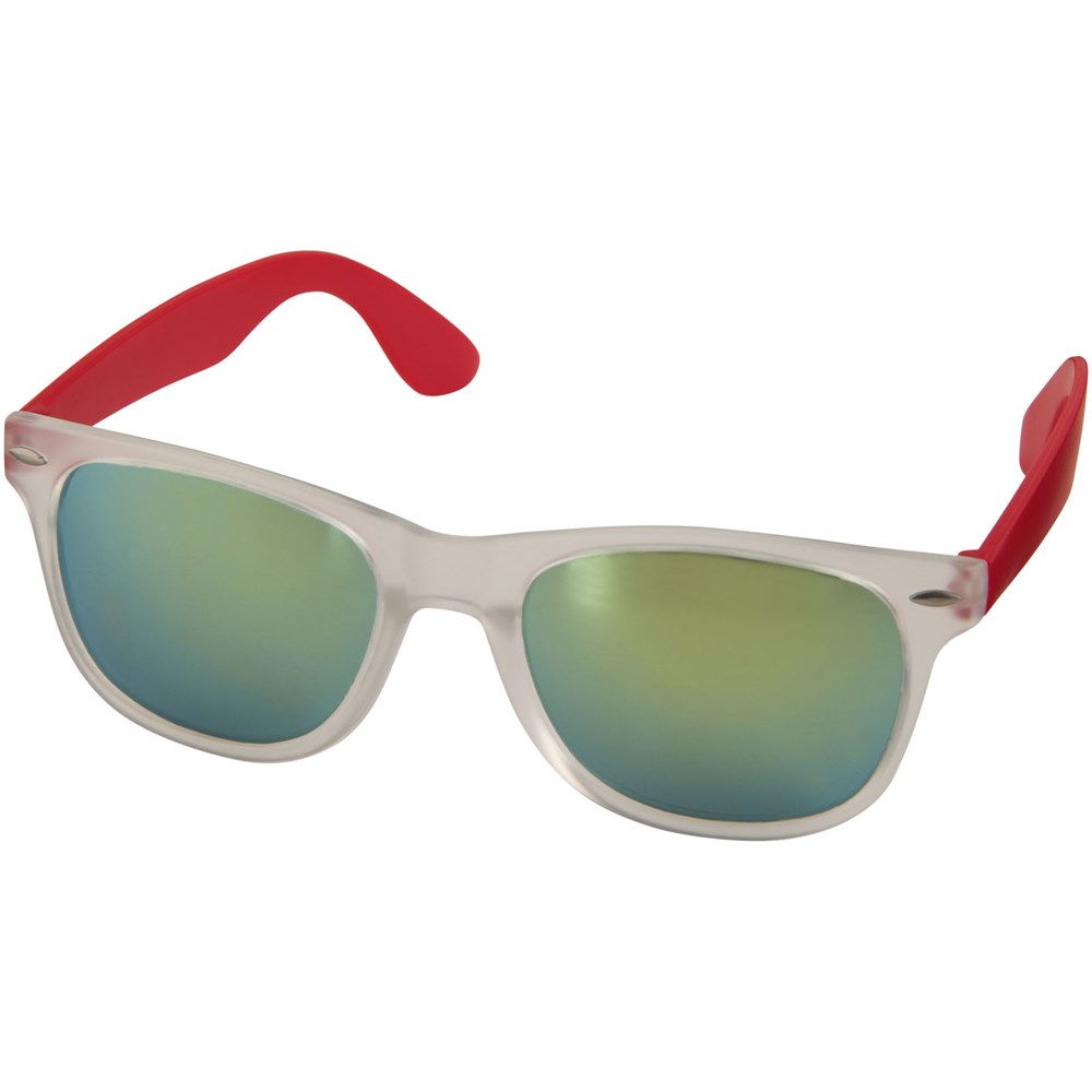 Retro design glazen met mat witte frame, categorie 3 spiegellenzen in 3 verschillende tinten en bijpassend kleur tinten. Conform EN ISO 12312-1 en met UV400. Standaard komt de bedrukking op 1 pootje.