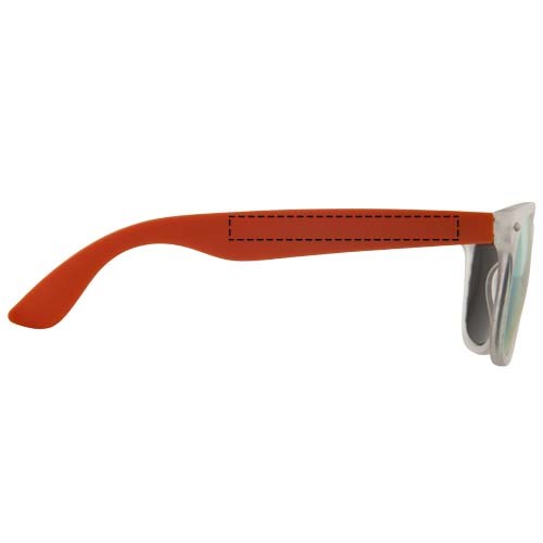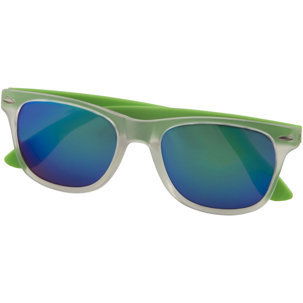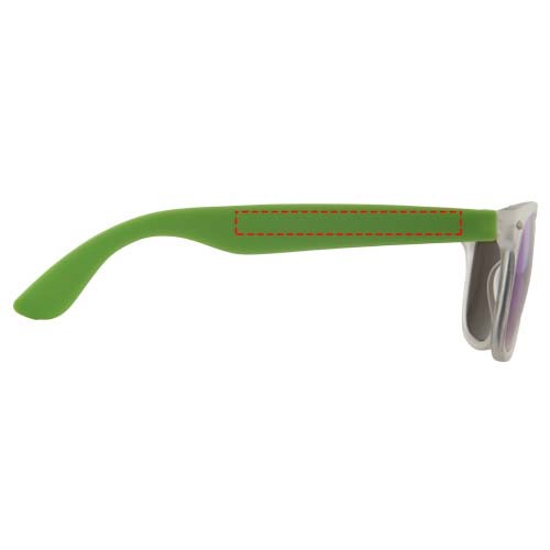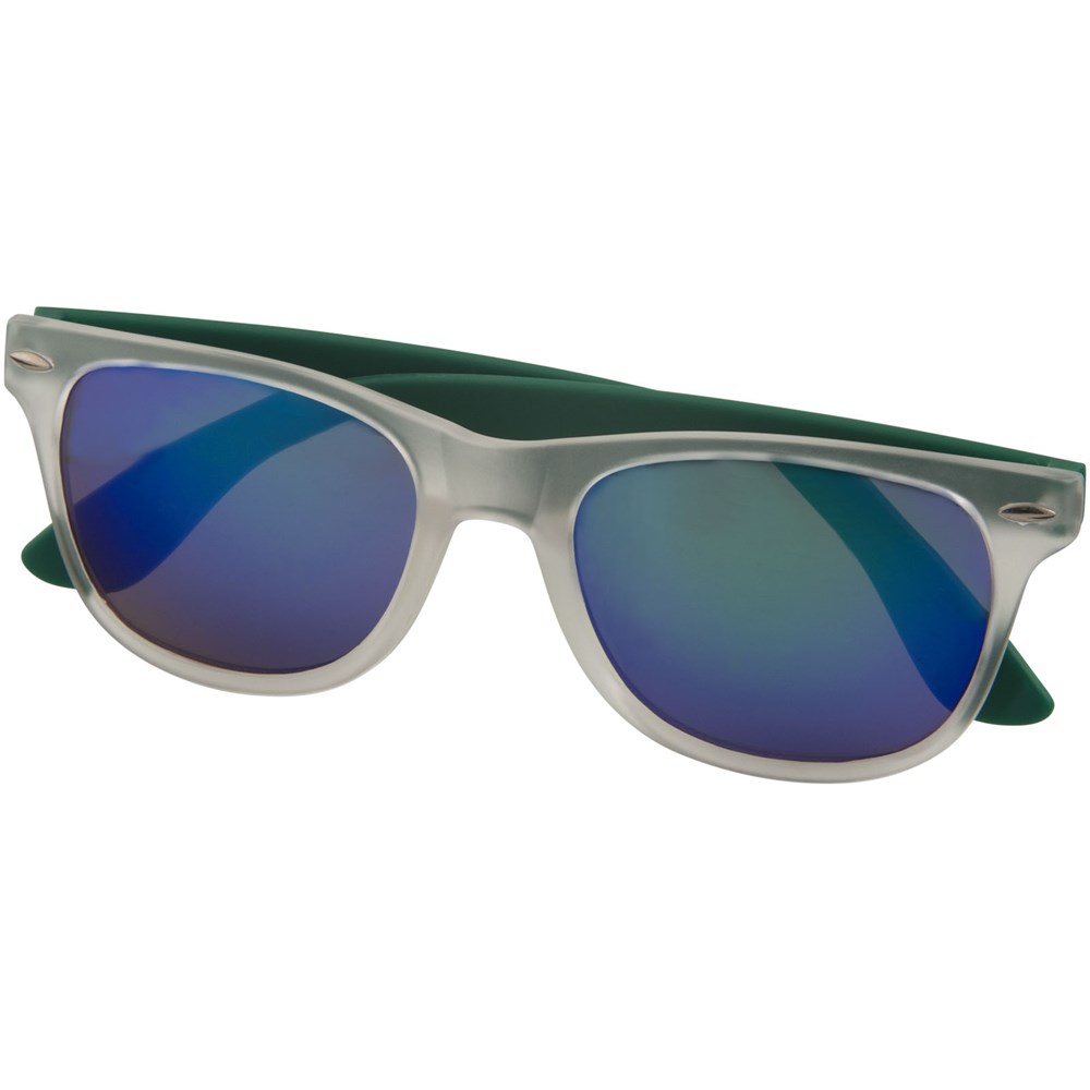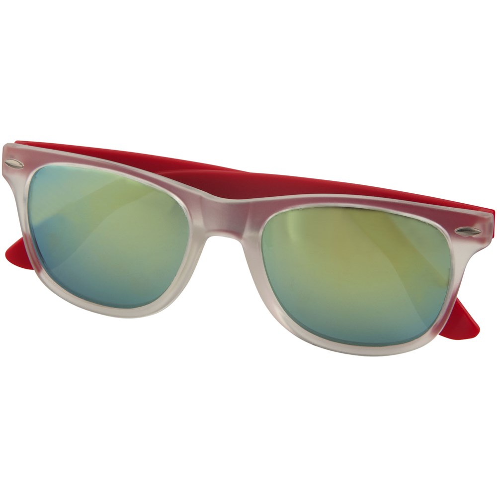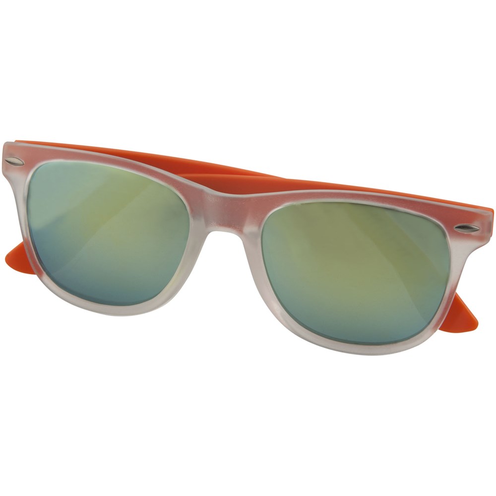 Retro design glazen met mat witte frame, categorie 3 spiegellenzen in 3 verschillende tinten en bijpassend kleur tinten. Conform EN ISO 12312-1 en met UV400. Standaard komt de bedrukking op 1 pootje.