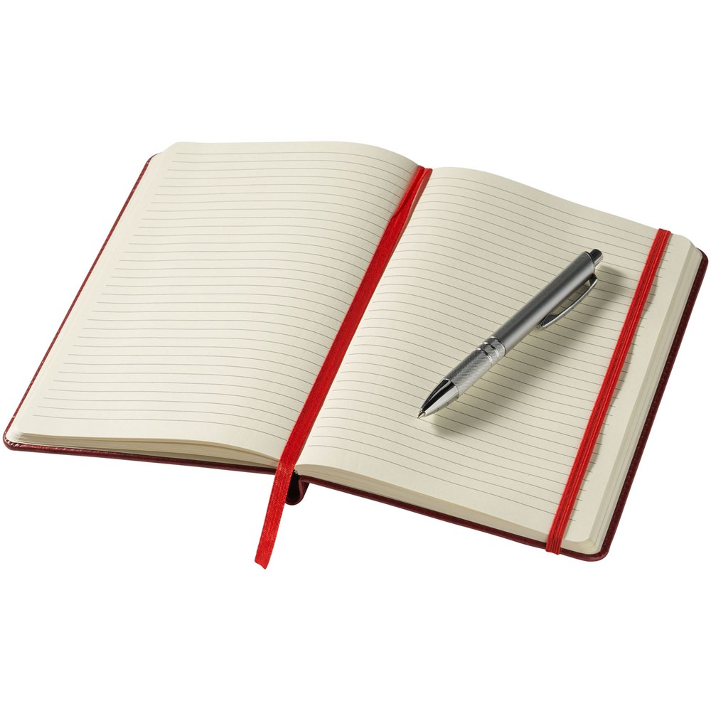 A5 formaat notitieboek met 80 pagina's van 70 gram gelinieerd papier, paginalint en elastieksluiting in bijpassende kleur en zilverkleurige balpen in de binding.