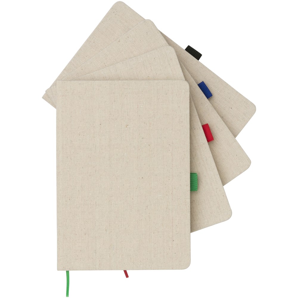 A5 formaat canvas notitieboekje met gekleurde elastieksluiting en paginalint. Een elastische penlus en 80 pagina's van 70 gram met gelinieerd papier.