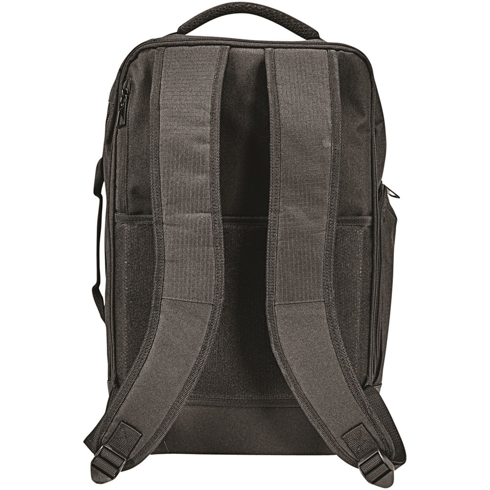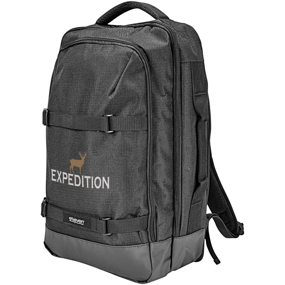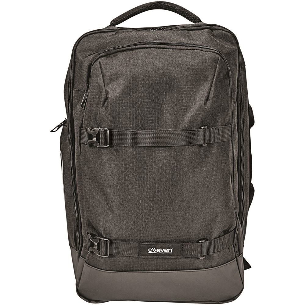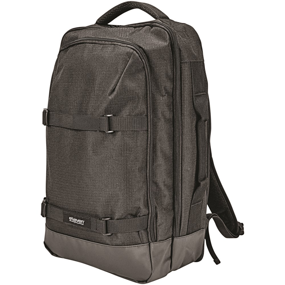 Multi 2 strap laptop rugzak. De elleven-laptop-rugzak met twee hengsels is een veelzijdige rugzak ontworpen om uw zakelijke benodigdheden of reisartikelen mee te nemen. De binnenkant van deze rugzak bevat elastische compressiebanden om al uw spullen op hun plek te houden. Deze tas heeft het allemaal, met een TSA-vriendelijke 15-inch laptop compartiment, verstelbare draagbanden en een handgreep aan de zijkant voor gemakkelijk pakken en RFID-bescherming. 600 ripstop.