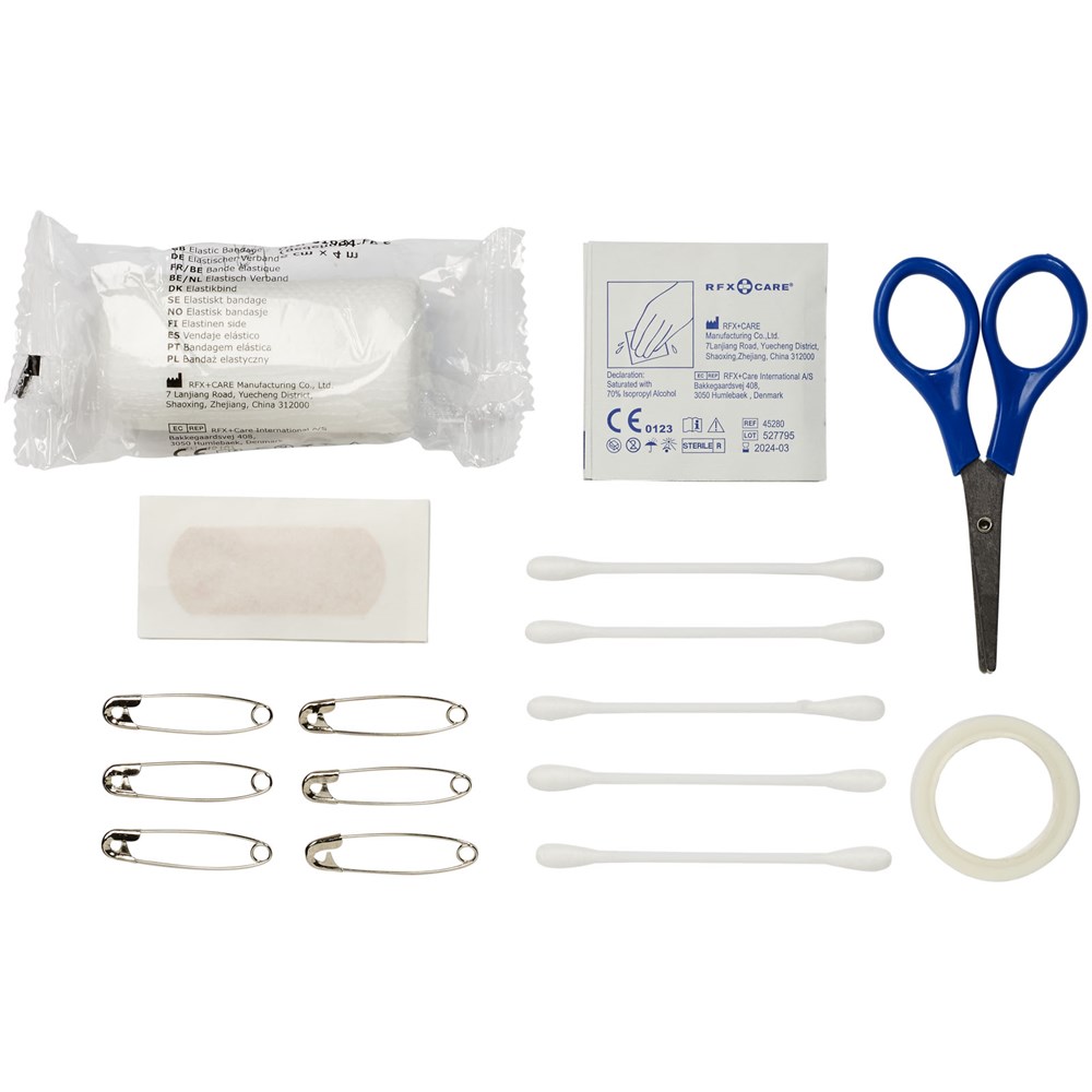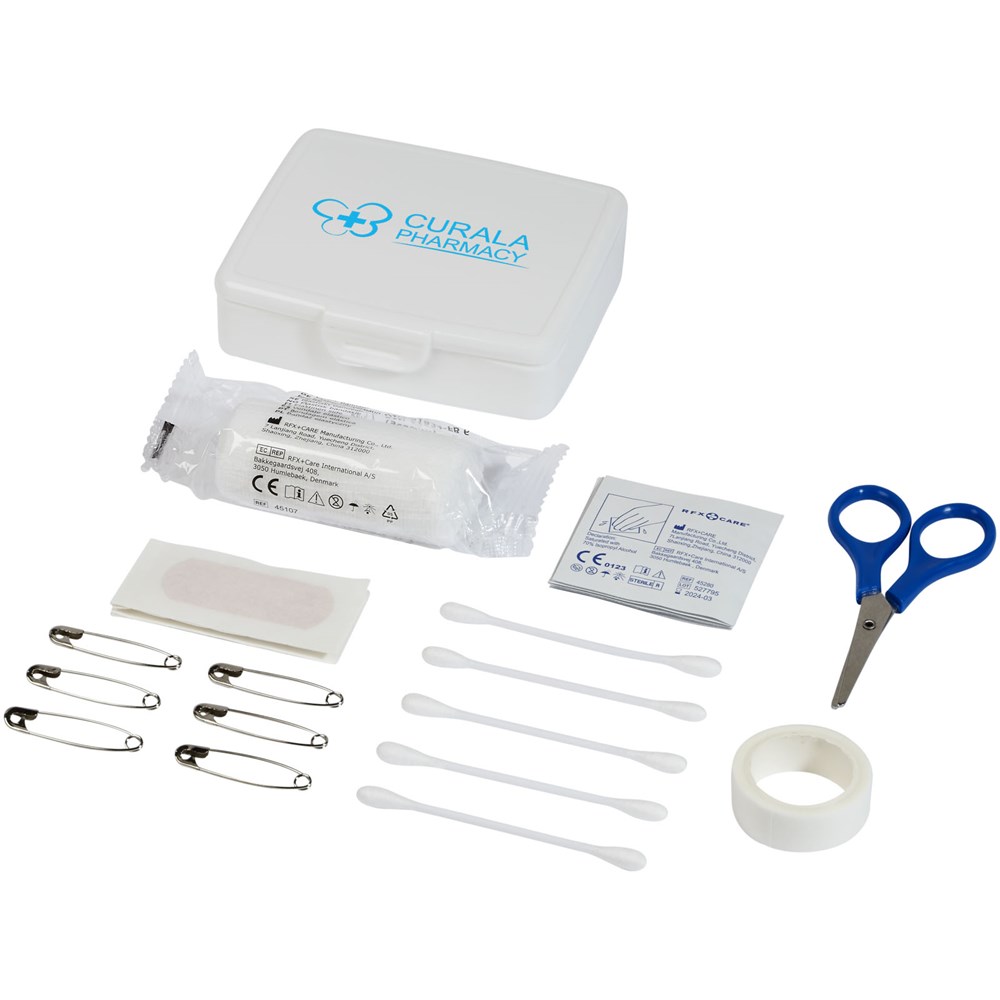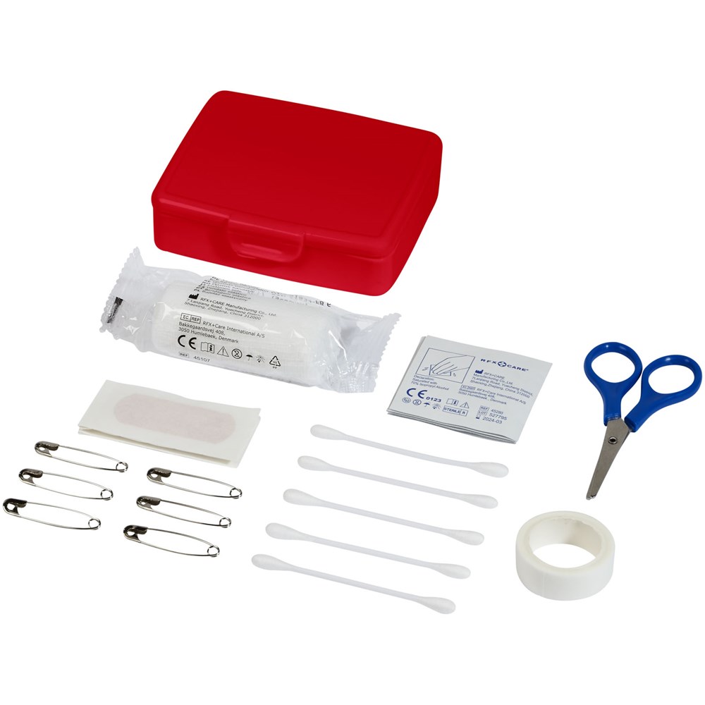 Frederik 24-delige plastic EHBO-koffer. Handige kunststof doos met vouwdeksel met 24 EHBO-benodigdheden. Zeer geschikt voor thuis, in de auto of op het werk en heeft een groot decoratievlak op het deksel. EHBO-sets helpen je bij het uitvoeren van een eenvoudige wondbehandeling om de secundaire verwondingen te verminderen. Een EHBO-koffer wordt beschouwd als een medisch hulpmiddel en is onderworpen aan 93/42/EEG, op basis van het beoogde gebruik: "diagnose, preventie, controle, behandeling of verlichting van ziekte". Dit medisch hulpmiddel is van KLASSE I, Is. Polypropyleen.