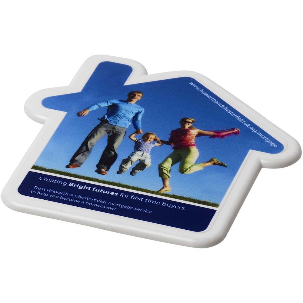 Huisvormige onderzetters gemaakt van wit kunststof.