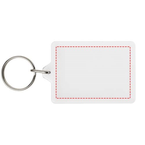 Doorzichtige rechthoekige C1 sleutelhanger met metalen sleutelring . De metalen lusring biedt een vlak profiel dat ideaal is voor de post. Afmetingen van het te bedrukken inzetstuk: 5,0 cm x 3,5 cm.