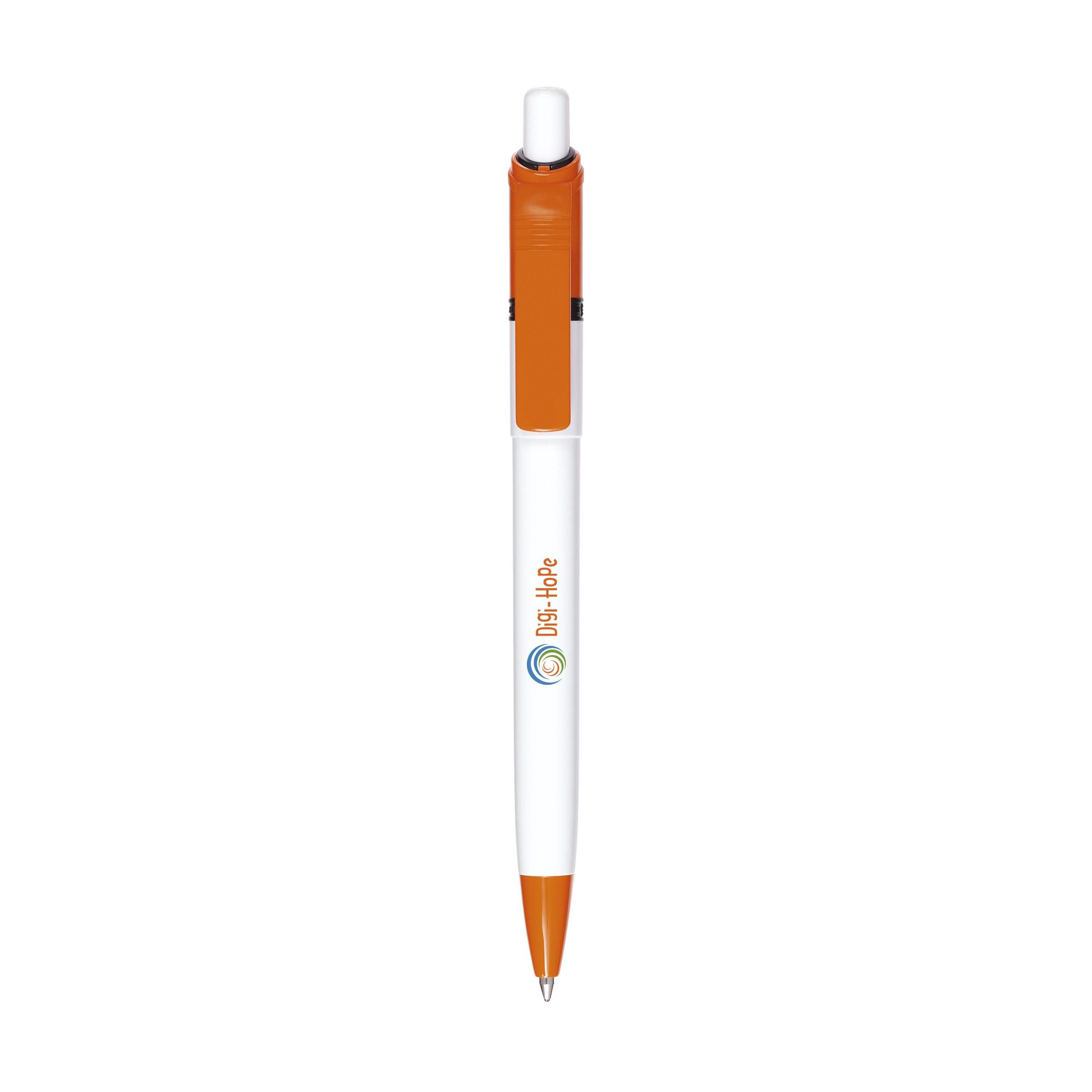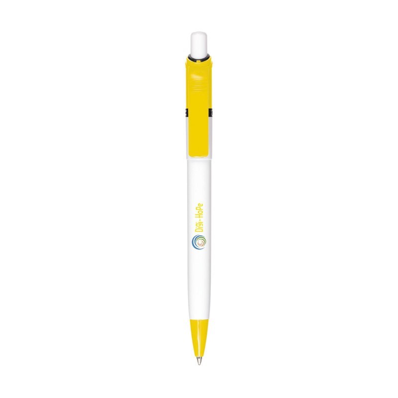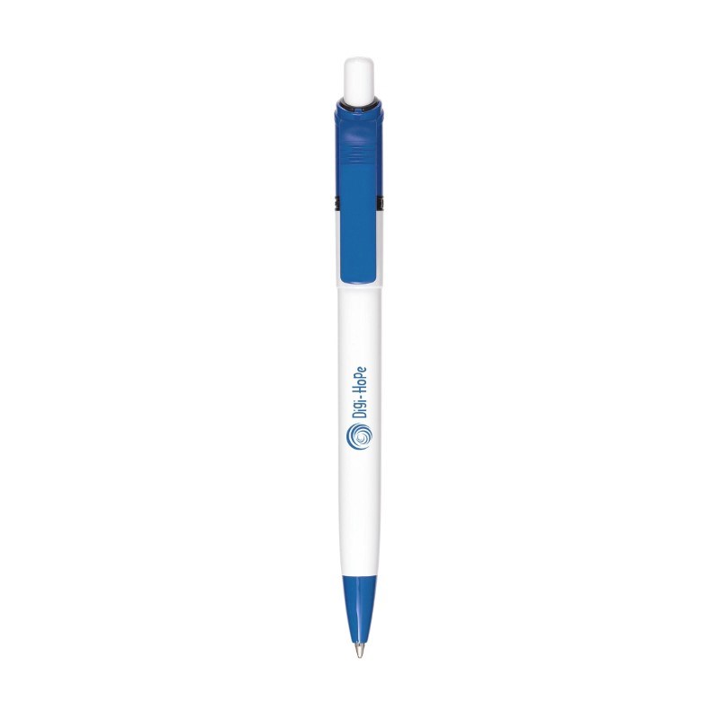 Blauwschrijvende balpen met gekleurde clip en puntstuk. Made in Italy.