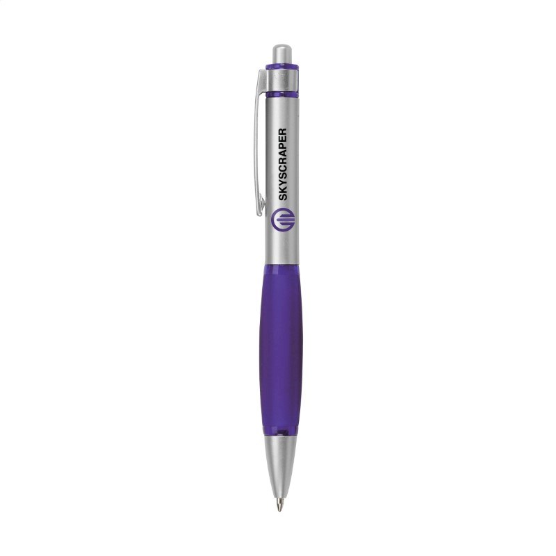 Blauwschrijvende balpen met gripvast, transparantgekleurd rubberen voorstuk, en metalen clip.