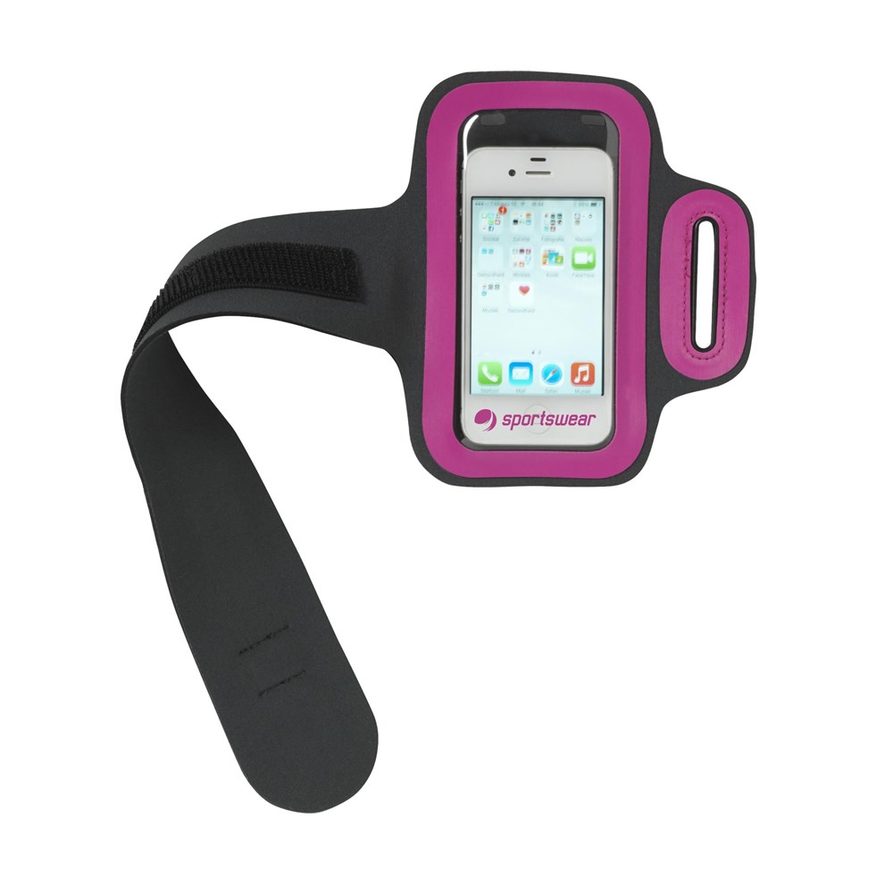 Sportarmband van soepel materiaal. Met klittenband en transparant venster. Afm. opening achterzijde 7 cm breed. Afm. venster 6,2 x 13 cm.