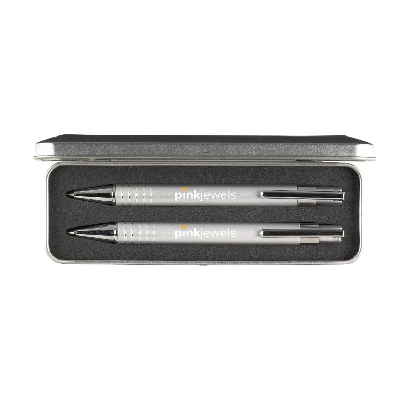 Metalen schrijfset: blauwschrijvende balpen en vulpotlood met 3 HB vullingen (0,7 mm). Beide met hoogglans laklaag. In geschenkblik. Per set in doosje.